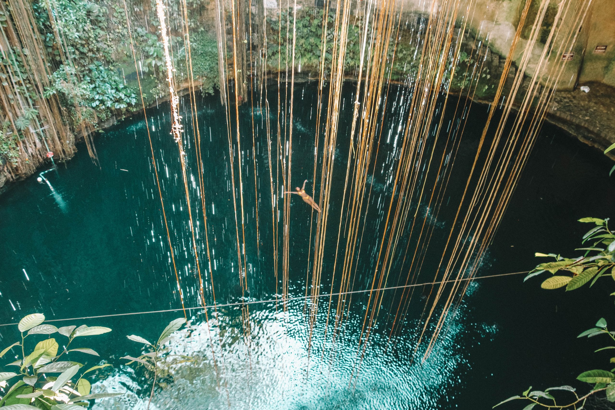 Another beautiful cenote near Chichén Itzá is the Ik Kil Cenote. Personally, I think this is the coolest cenote we visited! Ik Kil, also called Sacred Blue Cenote, is about 40 a minutes’ drive from Valladolid and can be combined with a visit to Chichén Itzá. We arrived early, with almost no other people in the cenote. Besides two divers, we were the only one in the cenote. What makes the cenote so special are the lianas and all the plants that grow inside. Truly an awesome sight!